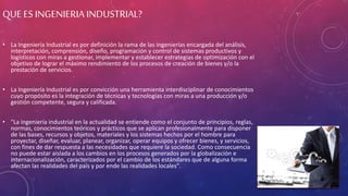 La ingeniería industrial es la rama de ingeniería encargada de analizar, diseñar y optimizar sistemas productivos. Richard Arkwright fue pionero al crear el primer torno mecánico de hilar e implementar controles administrativos en fábricas. Los ingenieros industriales estudian materias técnicas y administrativas para mejorar la productividad de empresas mediante el uso eficiente de recursos humanos, tecnológicos y financieros.