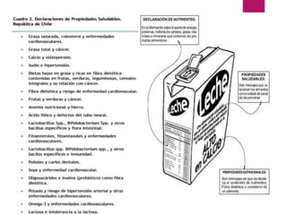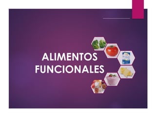 El documento trata sobre los alimentos funcionales. Explica que surgen en Japón en los años 1970 con el objetivo de reducir costos de salud pública. Se definen como alimentos que proveen beneficios más allá de sus nutrientes, mejorando la salud y reduciendo riesgos de enfermedades. Pueden ser alimentos naturales o procesados a los que se les extrae, reemplaza o agrega componentes. Deben demostrar sus efectos beneficiosos de manera científica.