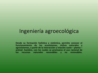 Este documento describe un programa de ingeniería agroecológica que responde a las necesidades del sector agropecuario bajo una sólida formación en ingeniería aplicada y compromiso ambiental. El programa enseña sobre los ecosistemas y agrosistemas para promover el uso sostenible de recursos. El ingeniero agroecológico crea tecnologías viables para soluciones de productividad agrícola sostenible integrando conocimientos científicos y locales.