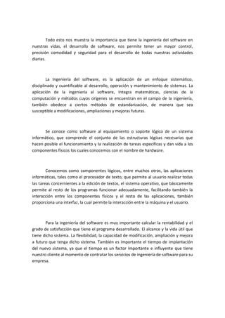 El documento describe la importancia creciente de la ingeniería de software en diversos campos como la medicina, la educación, los negocios y la ciencia. La ingeniería de software aplica un enfoque sistemático y cuantificable al desarrollo de software, que permite un mayor control, precisión, comodidad y seguridad en las actividades diarias. Es importante que el software desarrollado maximice la rentabilidad, satisfacción del cliente, alcance, vida útil, flexibilidad y minimice el tiempo de implantación.
