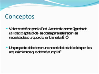 La ingeniería de valor es un método sistemático para analizar y mejorar el valor de un producto u servicio mediante la reducción de costos mientras se mejora el rendimiento y la calidad. El proceso involucra cuatro fases: información, especulativa, analítica y propuesta. Un ejemplo analizó dos alternativas de diseño para un estacionamiento, encontrando que una opción con espacios más grandes aumentó los costos en un 17% pero mejoró la capacidad en un 23.9%. La ingeniería de valor busca optimizar la calidad y re