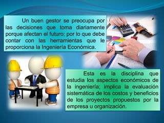 El documento describe la historia y el desarrollo de la ingeniería económica. Explica que la disciplina estudia los aspectos económicos de la ingeniería e implica la evaluación sistemática de los costos y beneficios de proyectos propuestos. Señala que la obra de Arthur Wellington en 1887 inició el interés de la ingeniería en las evaluaciones económicas y que en las décadas de 1920 y 1930, J. C. L. Fish, O. B. Coldman y Eugene Grant desarrollaron modelos y métodos para el análisis econ