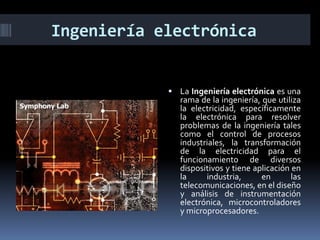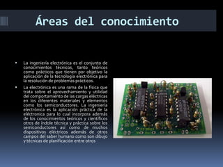 La ingeniería electrónica utiliza la electricidad y electrónica para resolver problemas de ingeniería en industrias, telecomunicaciones e instrumentación electrónica. Cubre áreas como semiconductores, electrónica de potencia, computadoras digitales, control de procesos industriales y telecomunicaciones.