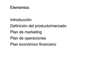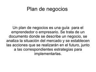 Un plan de negocios describe un negocio, analiza el mercado y establece estrategias y acciones futuras; incluye una introducción, definición del producto y mercado, planes de marketing, operaciones y finanzas, así como consideraciones sobre mercadotecnia y competitividad tecnológica.
