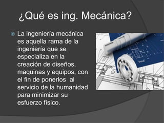El documento describe la ingeniería mecánica, la cual se especializa en el diseño de máquinas y equipos para minimizar el esfuerzo humano. Explica que los ingenieros mecánicos deben tener conocimientos en ciencias e ingeniería y ser capaces de liderar proyectos de diseño, implementación y mantenimiento de equipos industriales. Finalmente, menciona algunos de los ingenieros mecánicos más importantes de la historia como Leonardo Da Vinci y sus inventos pioneros.