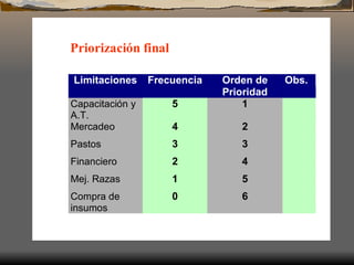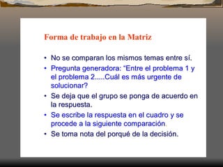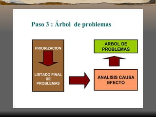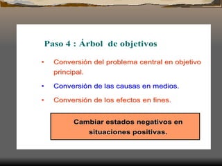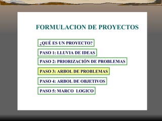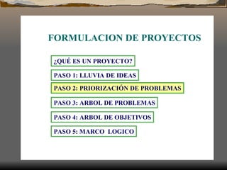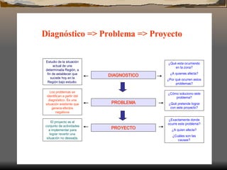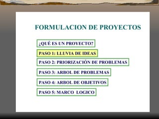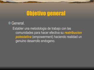 El documento presenta una metodología para promover el desarrollo endógeno de las comunidades a través de la reatribución potestativa (empoderamiento) mediante la formulación participativa de proyectos. La metodología incluye técnicas como lluvia de ideas, priorización de problemas, árboles de problemas y objetivos, y marco lógico para definir, planificar y evaluar proyectos comunitarios potenciales en áreas como agricultura sostenible y empresas locales.