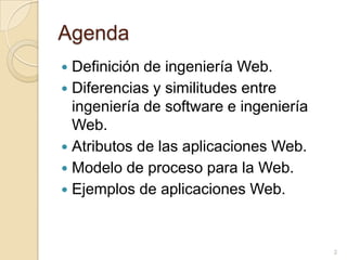 El documento aborda la ingeniería web, definiéndola como la aplicación de metodologías sistemáticas al desarrollo de aplicaciones web de alta calidad. Se compara con la ingeniería de software, destacando diferencias y similitudes en sus enfoques y en la garantía de calidad, y se describen los atributos de las aplicaciones web, así como su proceso de desarrollo. Finalmente, se presentan ejemplos prácticos de aplicaciones web, como reservas de mesas y alquiler de autos.