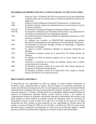 El documento presenta la filosofía de diseño sísmico aceptada a nivel mundial, la cual establece que las estructuras deben resistir sismos frecuentes sin daños y resistir el sismo máximo esperado sin colapsar, aunque puedan sufrir daños. También describe los principales desarrollos en ingeniería antisísmica a nivel mundial y en Chile, así como las normas sísmicas chilenas actuales para edificios, estructuras industriales y otros tipos de construcciones.