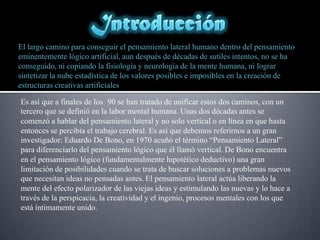El documento habla sobre la inteligencia artificial y los diferentes enfoques que se han tomado para lograrla, incluyendo el pensamiento lógico y lateral. También describe los diferentes tipos de inteligencia artificial como la convencional basada en reglas y la computacional basada en aprendizaje, así como la posibilidad de incorporar componentes emocionales para mejorar la efectividad de los sistemas inteligentes.