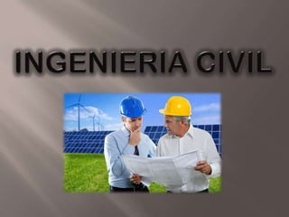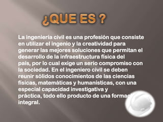 El documento describe la ingeniería civil como una profesión que utiliza la creatividad para generar soluciones que permitan el desarrollo de la infraestructura física de un país. La ingeniería civil requiere un compromiso con la sociedad y conocimientos sólidos en ciencias, matemáticas y humanidades. Los estudios de ingeniería civil en España tienen más de 200 años de antigüedad y surgieron a partir de la ingeniería militar.