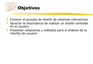 El documento describe los principales conceptos relacionados con el diseño centrado en el usuario de sistemas interactivos. Explica que el diseño de la interfaz debe considerarse desde el principio del proceso de desarrollo y debe estar centrado en las necesidades del usuario. Presenta diferentes técnicas como prototipos, análisis de tareas y notaciones para el diálogo que permiten la especificación y evaluación de la interfaz desde una perspectiva de usuario.