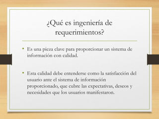 La ingeniería de requerimientos es esencial para garantizar la calidad de un sistema de información, alineándose con las expectativas de los usuarios. Este proceso incluye actividades como extracción, análisis, especificación y validación de requerimientos, tanto funcionales como no funcionales. Se enfrenta a desafíos como la ambigüedad del lenguaje y la interrelación de los requerimientos a lo largo del ciclo de desarrollo.