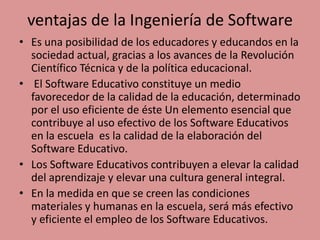 La ingeniería de software educativo sigue un proceso sistemático de análisis, diseño, desarrollo, prueba e implementación para crear software educativo. Este software puede mejorar la calidad de la educación y elevar el aprendizaje de los estudiantes cuando los docentes lo integran de manera efectiva en el currículo escolar. La evaluación del uso del software educativo por los docentes produce una guía que describe opciones de integración pedagógica sin prescribir formas de uso específicas.
