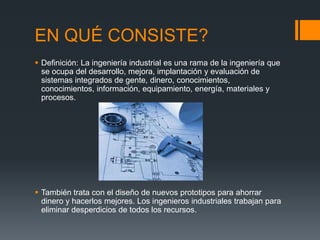 La ingeniería industrial se ocupa del desarrollo, mejora, implementación y evaluación de sistemas integrados que incluyen personas, dinero, conocimiento, equipos, energía, materiales y procesos. Los ingenieros industriales buscan optimizar procesos, mejorar la eficiencia y productividad de las empresas, y eliminar desperdicios. Estos estudios están dirigidos a estudiantes interesados en matemáticas, física, mecánica y otras áreas técnicas que deseen trabajar en el diseño y mejora de procesos y