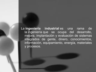 La ingeniería industrial se ocupa del desarrollo, mejora, implantación y evaluación de sistemas integrados que involucran personas, dinero, conocimientos, información, equipamiento, energía, materiales y procesos. Su misión principal es controlar y elevar el desempeño de las empresas e industrias para hacerlas más exitosas y competitivas, lo que trae mayor bienestar económico. Es el eslabón clave entre el planeamiento de las metas de dirección y la ejecución operacional. Estudiar ingeniería industrial permite relacionar diferentes