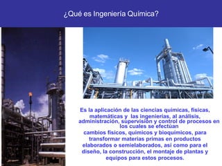 El documento describe la carrera de Ingeniería Química, incluyendo su definición, objetivos, perfil profesional, campo ocupacional y las funciones de un ingeniero químico. Explica que la Ingeniería Química aplica principios de ciencias como química, física y matemáticas para diseñar y operar procesos industriales que transforman materias primas en productos elaborados. Los ingenieros químicos trabajan en industrias, plantas, laboratorios de investigación y universidades optimizando proces
