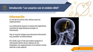 Este documento explica los conceptos básicos de la ingeniería social. Define la ingeniería social como el acto de manipular a una persona a través de técnicas psicológicas para que revele información sensible sin darse cuenta. Explora cómo piensan diferentes tipos de atacantes como insiders, estafadores, espías y reclutadores. También describe técnicas comunes como el phishing y cómo los atacantes aprovechan temas de actualidad para engañar a las víctimas.