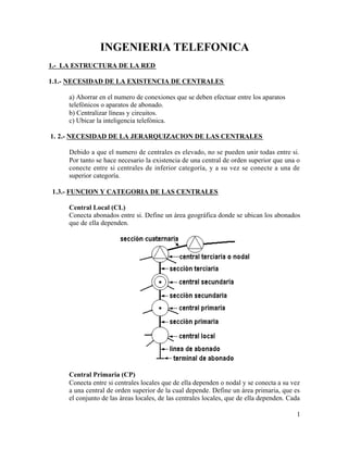 1) La estructura de la red telefónica se organiza de forma jerárquica con diferentes categorías de centrales, desde centrales locales hasta centrales terciarias o nodales, para conectar de forma eficiente los teléfonos de los abonados. 2) Existen centrales de diferentes tipos en áreas rurales, urbanas y multicentrales para optimizar la transmisión del tráfico telefónico. 3) El tráfico telefónico se presenta de forma aleatoria pero también sigue variaciones periódicas y puede medirse en términos de tiempo de