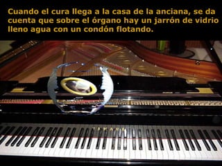 Un cura visita a una profesora de piano y órgano de 85 años para felicitarla por su cumpleaños. Al llegar a su casa, el cura ve un condón flotando en un jarrón con agua sobre el órgano, lo cual le sorprende. Tras hablar un rato, el cura no puede contener su curiosidad y le pregunta a la profesora sobre el condón, a lo que ella responde que lo puso allí siguiendo las instrucciones de un sobrecito que encontró para prevenir enfermedades, y que desde entonces no