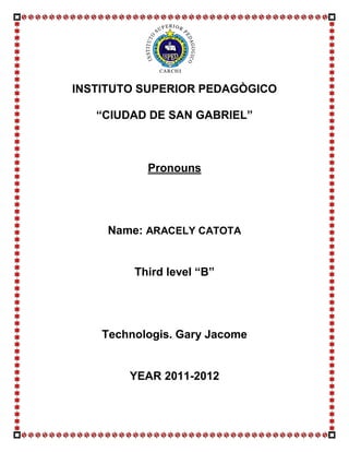 INSTITUTO SUPERIOR PEDAGÒGICO “CIUDAD DE SAN GABRIEL” Pronouns Name: ARACELY CATOTA Third level “B” Technologis. Gary Jacome YEAR 2011-2012