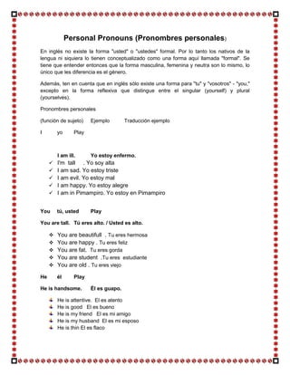 Personal Pronouns (Pronombrespersonales) En inglés no existe la forma "usted" o "ustedes" formal. Por lo tanto los nativos de la lengua ni siquiera lo tienen conceptualizado como una forma aquí llamada "formal". Se tiene que entender entonces que la forma masculina, femenina y neutra son lo mismo, lo único que les diferencia es el género. Además, ten en cuenta que en inglés sólo existe una forma para "tu" y "vosotros" - "you," excepto en la forma reflexiva que distingue entre el singular (yourself) y plural (yourselves). Pronombres personales (función de sujeto) Ejemplo Traducción ejemplo I yo Play I am ill. Yo estoy enfermo.  I'm tall . Yo soy alta  I am sad. Yo estoy triste  I am evil. Yo estoy mal  I am happy. Yo estoy alegre  I am in Pimampiro. Yo estoy en Pimampiro You tú, usted Play You are tall. Tú eres alto. / Usted es alto.  You are beautifull . Tu eres hermosa  You are happy . Tu eres feliz  You are fat. Tu eres gorda  You are student .Tu eres estudiante  You are old . Tu eres viejo He él Play He is handsome. Él es guapo. He is attentive. El es atento He is good El es bueno He is my friend El es mi amigo He is my husband El es mi esposo He is thin El es flaco