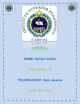 Este documento proporciona una lista de pronombres personales, posesivos y reflexivos en inglés y sus traducciones al español. Explica que en inglés no existe la forma "usted" y que sólo hay una forma de "tú/vosotros" escrita "you". Además, ofrece ejemplos para ilustrar el uso de cada pronombre.