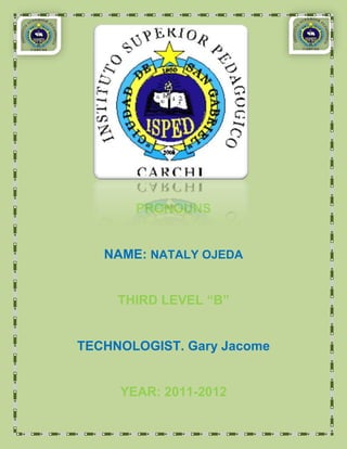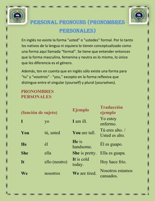 Este documento proporciona información sobre pronombres personales, posesivos y reflexivos en inglés. Explica que no existe la forma "usted" y que "you" se usa tanto para "tú" como "vosotros". Además, ofrece tablas con los diferentes pronombres traducidos al español y ejemplos de su uso.