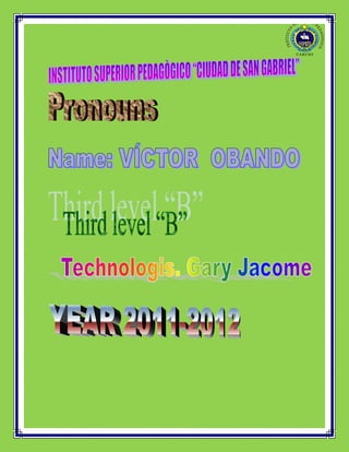 El documento resume los pronombres personales en inglés. Explica que no existe la forma formal "usted" o "ustedes", sino que solo existe la forma "you". También describe las formas de sujeto como "I", "you", "he", "she", "it", "we" y "they". Finalmente, presenta ejemplos de los pronombres personales en función de sujeto y objeto directo con sus traducciones al español.