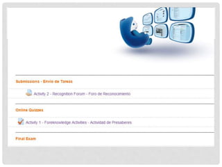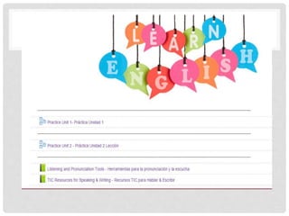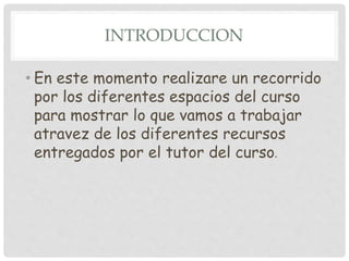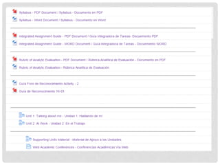 Este documento presenta una introducción al curso de inglés 1 y resume los diferentes espacios de aprendizaje que se encontrarán en el curso, incluyendo información inicial, enlaces interactivos, entorno de conocimiento, aprendizaje colaborativo, aprendizaje práctico, evaluación y seguimiento, y gestión. Cada espacio contiene recursos y herramientas para las actividades, así como detalles sobre las tareas y evaluaciones que los estudiantes completarán a lo largo del curso.