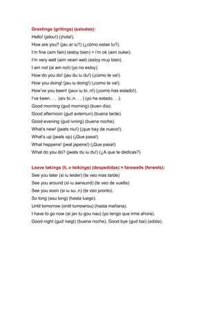 Este documento presenta vocabulario y expresiones comunes para saludos, presentaciones, despedidas en inglés. Incluye preguntas como "¿Cómo te llamas?", "¿De dónde eres?" y respuestas como "Mi nombre es...", "Soy de...". También incluye frases para saludar como "Hola", "Mucho gusto" y despedirse como "Adiós", "Hasta luego". Termina con un breve diálogo de muestra aplicando este vocabulario entre dos personas que se presentan y se despiden.