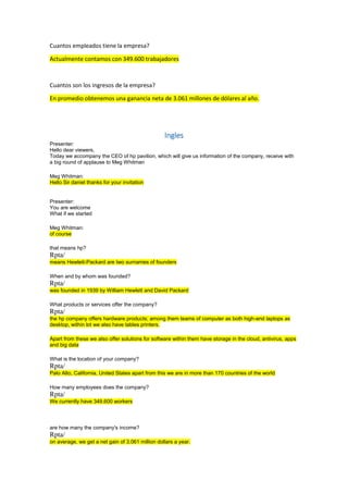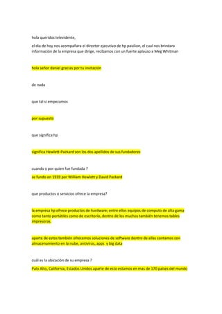 El documento presenta una entrevista con la directora ejecutiva de HP Pavilion, Meg Whitman. En la entrevista, Whitman explica que HP fue fundada en 1939 por William Hewlett y David Packard en Palo Alto, California. Actualmente, HP ofrece una amplia gama de productos de hardware y software, emplea a 349,600 personas y genera ingresos anuales netos de aproximadamente 3.061 millones de dólares.