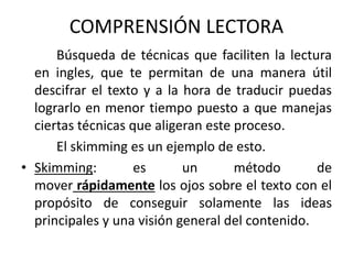 El documento describe diferentes técnicas para mejorar la comprensión lectora y traducción de textos en inglés, incluyendo skimming, el cual permite obtener las ideas principales de manera rápida, la traducción de lecturas especializadas según la carrera para comprender términos técnicos fácilmente, y el análisis de textos que ponen en práctica lo aprendido en inglés a través de la enseñanza y cooperación en grupo.
