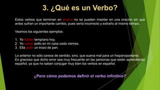 El documento define el verbo como una palabra que expresa una acción realizada por un sujeto. Explica que los verbos existen primero en forma infinitiva, terminando en "-ar", "-er", o "-ir". Para usarlos en oraciones, los verbos infinitivos deben conjugarse según el sujeto y tiempo, por ejemplo "Yo hablar" es incorrecto, pero debe ser "Yo hablo". La conjugación proporciona información sobre quién realiza la acción, cuál es la acción, y en qué tiempo ocurre.