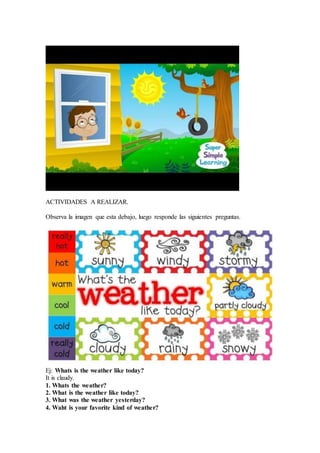 El documento presenta información sobre una lección de inglés sobre el clima en el grado 10o A de bachillerato en el Centro Educativo Francisco enriques y Carvajal, incluyendo definiciones del clima en inglés y español, un video explicativo, y una serie de preguntas sobre el clima para que los estudiantes respondan.