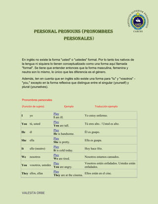 Este documento presenta una tabla de pronombres personales, posesivos, demostrativos, reflexivos y recíprocos en inglés. Explica las funciones de sujeto y objeto de los pronombres personales y posesivos, así como las diferencias entre los pronombres posesivos y el genitivo. También describe el uso de los pronombres demostrativos, reflexivos y recíprocos.