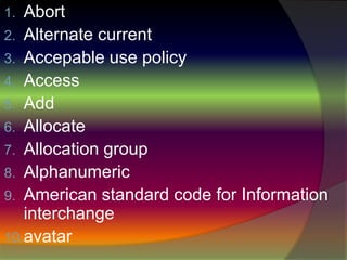 El documento lista 30 términos técnicos relacionados con computación e internet, incluyendo "abort", "alternate current", y "American standard code for information interchange". Luego, cada término se define brevemente en español.