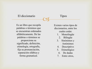 El documento describe diferentes tipos de diccionarios, incluyendo monolingües, bilingües y de sinónimos y antónimos. Explica que un diccionario monolingüe define palabras en un solo idioma, mientras que uno bilingüe lo hace en dos idiomas. Además, un diccionario de sinónimos y antónimos lista palabras con significados similares u opuestos.