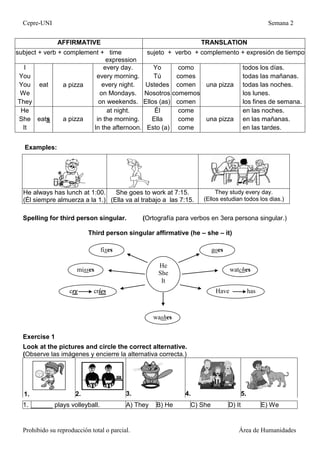 El documento presenta un diálogo en inglés entre dos estudiantes sobre sus hábitos diarios y luego proporciona instrucciones sobre el uso del Simple Present para describir rutinas y acciones habituales. El resumen es el siguiente: