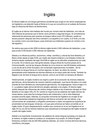 El inglés es el idioma más hablado en el mundo, con más de 350 millones de hablantes. Aunque es la tercera lengua materna más hablada, detrás del chino mandarín y el español, su influencia política y económica a través del Imperio Británico y los Estados Unidos lo han convertido en la lingua franca internacional predominante. El inglés moderno evolucionó a partir de los dialectos germánicos hablados por los anglosajones que se establecieron en Gran Bretaña en el siglo V d.C., a