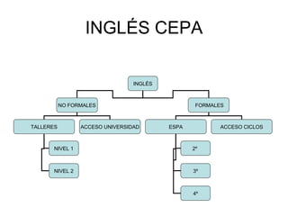 El documento describe diferentes opciones para acceder a la universidad, incluyendo cursos de inglés y español formales e informales, talleres de acceso y ciclos de nivel 1 a 4.
