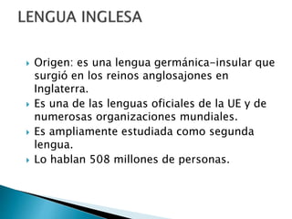 El inglés es una lengua germánica que surgió en Inglaterra y ahora es hablada por más de 500 millones de personas. La adquisición de una lengua extranjera como el inglés requiere el desarrollo de destrezas lingüísticas como escuchar, hablar, leer y escribir a través de actividades lúdicas y el uso de las TIC. La enseñanza del inglés comienza en edades tempranas y se centra en desarrollar la competencia comunicativa de los estudiantes.