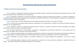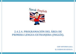 Este documento presenta la programación del área de lengua extranjera (inglés) para el CEIP Antonio Gala. Establece los objetivos del área, que incluyen desarrollar las habilidades comunicativas de los estudiantes a través del uso de métodos comunicativos y tareas. También describe las orientaciones metodológicas, como dar prioridad a las habilidades orales en los primeros grados e integrar las lenguas a través de un proyecto lingüístico de centro. Finalmente, presenta los criterios de evaluación para cada