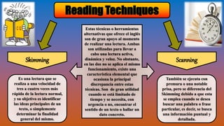 Este documento resume varias técnicas de lectura en inglés como skimming, scanning y traducción. Explica que skimming se usa para identificar las ideas principales de un texto rápidamente, scanning para encontrar información específica, y la traducción para reforzar el aprendizaje del idioma. También define la comprensión lectora como un proceso de interacción entre el lector y el texto. Finalmente, concluye que el inglés es considerado un idioma universal debido a su amplia extensión global.