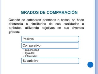Este documento compara los grados de adjetivos y adverbios. Explica que el positivo denota la cualidad simple, el comparativo denota un grado mayor, menor o igual al comparar dos elementos, y el superlativo denota el grado más alto. Luego detalla cómo se forman el comparativo y superlativo para adjetivos cortos y largos mediante la adición de letras al final del adjetivo.