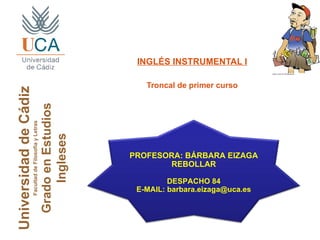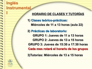 Este documento presenta la información sobre el curso de Inglés Instrumental I, incluyendo el horario de clases, objetivos, programa, metodología, intercambios lingüísticos con estudiantes estadounidenses, fechas límite para trabajos, consejos para los estudiantes y el sistema de evaluación. El curso se centra en mejorar las habilidades de listening, reading, speaking, use of English y writing de los estudiantes hasta el nivel B1 de inglés a través de clases teóricas, prácticas de laboratorio y tutorías.