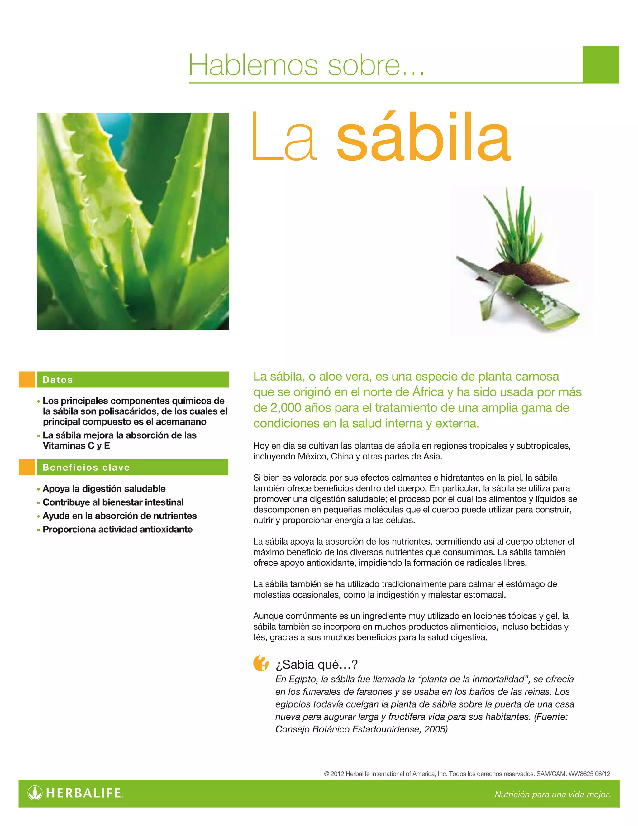 La sábila, originaria del norte de África, se ha usado por más de 2,000 años para tratar diversas condiciones de salud. Cultivada hoy en día en regiones tropicales y subtropicales, la sábila ofrece beneficios internos como apoyar la digestión y absorción de nutrientes, además de propiedades calmantes y antioxidantes. Tradicionalmente se ha usado también para aliviar molestias estomacales ocasionales.