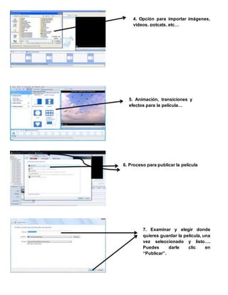 El documento proporciona instrucciones en 8 pasos para ingresar y utilizar el programa Movie Maker, incluyendo abrir el programa, agregar títulos, importar videos e imágenes, aplicar efectos y transiciones, seleccionar una ubicación para guardar la película una vez finalizada, y publicarla para que esté lista para verse.