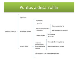 Los ingresos públicos son los recursos que el sector público obtiene para financiar los gastos públicos y satisfacer las necesidades básicas del país. Existen cinco principios legales que rigen los ingresos públicos: legalidad, progresividad, generalidad, igualdad y no confiscación. Los ingresos se clasifican económicamente en originarios, derivados, ordinarios y extraordinarios; y jurídicamente según las relaciones entre instituciones públicas y privadas.