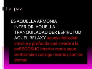 Este documento trata sobre el significado y la importancia de la paz. Define la paz como una armonía interior y tranquilidad espiritual que trae felicidad profunda y permite que las personas se sientan bien consigo mismas y con los demás. También describe la paz como un equilibrio espiritual y religioso, así como amor por uno mismo y los demás. Finalmente, señala que la paz es un anhelo fundamental de toda persona y sociedad.