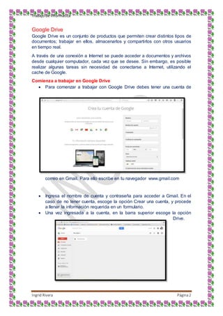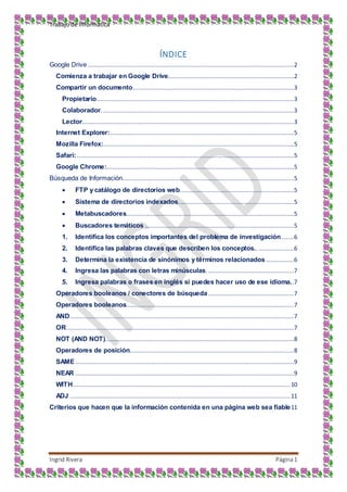 Este documento proporciona información sobre varios temas relacionados con la investigación en Internet, incluyendo Google Drive, navegadores web como Google Chrome e Internet Explorer, y técnicas de búsqueda como operadores booleanos y criterios para evaluar la fiabilidad de una página web. Explica cómo usar Google Drive para crear y compartir documentos y cómo funcionan conceptos como propietarios, colaboradores y lectores. También describe los principales tipos de motores de búsqueda e identifica pasos clave para realizar búsquedas exitosas